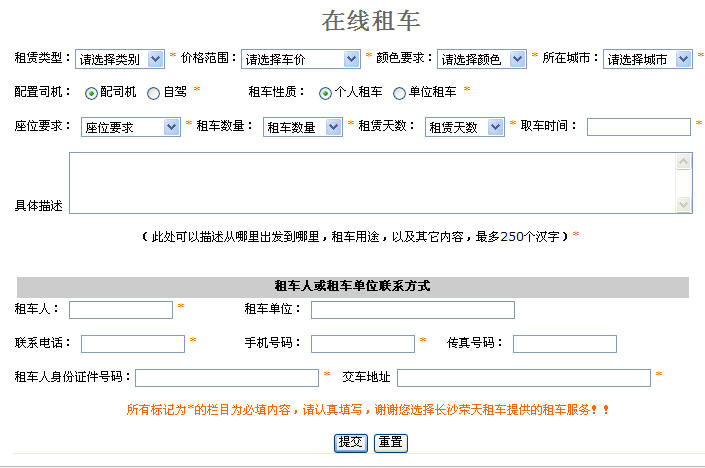 3、選擇或認(rèn)真填寫(xiě)帶"*"的欄目,尤其是租車(chē)人或租車(chē)單位的詳細(xì)信息。認(rèn)真填寫(xiě)上述必填信息將有助于我們及時(shí)和您取得聯(lián)系。